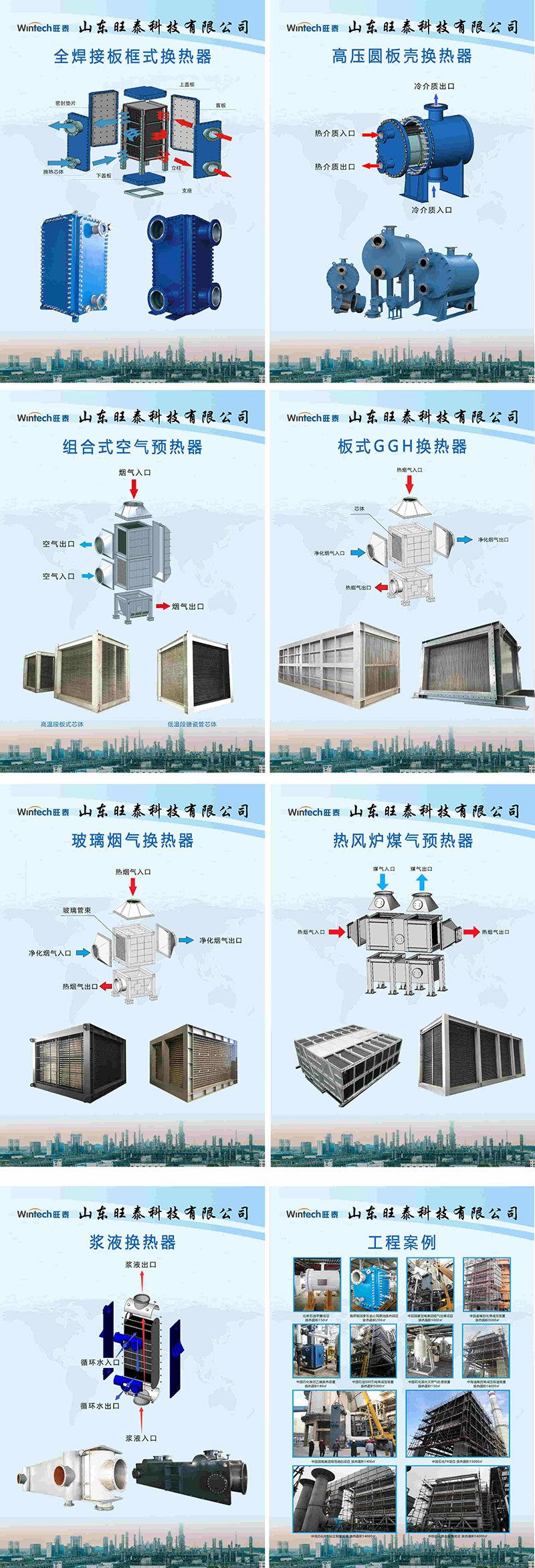 本次展會,旺泰科技重點展出的產品:全焊接板框式換熱器、高壓圓板殼換熱器、組合式空氣預熱器、板式GGH換熱器、玻璃煙氣換熱器、熱風爐煤氣預熱器、漿液換熱器。