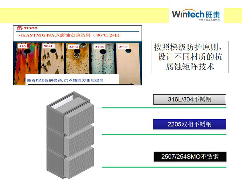 那么針對(duì)高爐雙預(yù)熱產(chǎn)品系統(tǒng)的防腐蝕技術(shù)要點(diǎn),大概有3點(diǎn):首先要精準(zhǔn)的控制煙氣的排煙溫度,我們要實(shí)現(xiàn)這一點(diǎn)呢,露點(diǎn)腐蝕溫度、選型、傳熱面積和操作控制條件都要進(jìn)行精準(zhǔn)的控制,一旦控制不好要么就產(chǎn)生腐蝕問題,要么就是余熱回收系統(tǒng)效果不好,浪費(fèi)能源,二、在煤氣預(yù)熱器的低溫段針對(duì)不同的腐蝕強(qiáng)度采用梯形材料選擇來控制腐蝕問題,就是在不同腐蝕強(qiáng)度的位置選用不同的抗腐蝕材料來對(duì)抗腐蝕問題,一般比較典型的材料組合,梯級(jí)組合就是254SMO加2205加316,針對(duì)一些腐蝕工況特別強(qiáng)的一些條件我們旺泰科技創(chuàng)新的提出了嵌入非金屬材料換熱模塊的技術(shù)來對(duì)抗這種非常強(qiáng)烈的腐蝕問題,另外針對(duì)一些特殊的工作工況也要注意一些防腐蝕技術(shù)的細(xì)節(jié)問題,比如再有煙氣有凝露的工作條件下我們要設(shè)置相應(yīng)的焊縫縫隙防滲漏的一些技術(shù),冬季工況金屬壁溫特別低的那些工作條件要在預(yù)熱器當(dāng)中設(shè)計(jì)空氣幕墻來提高金屬壁溫的這個(gè)問題。