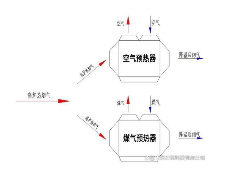 在高爐煉鐵行業(yè)當(dāng)中,延期的余熱回收溫度比較正常并不苛刻,大概工作溫度在300攝氏度左右,但是一般煙氣量比較大,因?yàn)槿紵娜剂鲜敲簹猱a(chǎn)生的煙氣量比較多,以1580高爐為例煙氣量能達(dá)到30萬標(biāo)立每小時(shí),所以整個(gè)余熱回收系統(tǒng)一般設(shè)計(jì)成雙預(yù)熱系統(tǒng),就是一部分煙氣去預(yù)熱助燃的空氣,另一部分煙氣去預(yù)熱燃料煤氣,