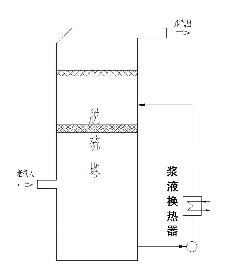 漿液冷凝法是濕法脫硫消除白色煙羽的主要技術(shù)方案之一,其主要特點(diǎn)是利用漿液換熱器將漿液與循環(huán)水或其他冷卻介質(zhì)進(jìn)行換熱,這樣降低了脫硫塔內(nèi)漿液的溫度,由于漿液溫度的降低脫硫塔內(nèi)煙氣的溫度也同時(shí)降低,煙氣的溫度降低,大大降低了煙氣攜帶可凝物的攜帶量,這樣就消除了煙氣的白色煙羽,也有部分客戶將這部分熱量換熱到循環(huán)水當(dāng)中,循環(huán)水的溫度再繼續(xù)進(jìn)行深度的余熱回收,這樣就同時(shí)兼具了白色煙羽的消除和余熱回收的功能,用鈣法濕法脫硫,