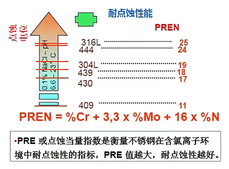 防護措施主要是:不銹鋼表面要定期清洗和維護,那么在氯離子海水介質(zhì)當中要提高流速,提高鋼的純凈度不要有雜質(zhì),另外就是選用耐點蝕當量PRN值高的不銹鋼,那么以這個表為例:316的耐腐蝕當量要遠遠高于40系不銹鋼的耐腐蝕當量。