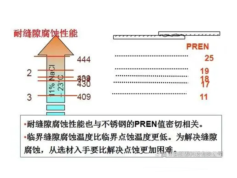 縫隙腐蝕避免的措施主要有:結構上避免產(chǎn)生縫隙、定期清洗以及流速涉及的相對比較高,同時也是選用耐腐蝕當量比較高的不銹鋼,以40系不銹鋼為例,那么444比409的耐腐蝕當量更要高,在工業(yè)當中一般是選擇雙相不銹鋼,它的耐腐蝕大概要遠遠高于40系以及30系不銹鋼。