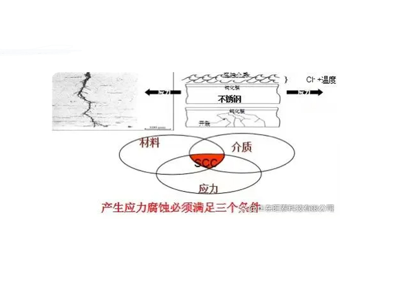 最后一個就是應力腐蝕,應力腐蝕是在應力以及介質(zhì)共同作用下產(chǎn)生的一種局部腐蝕。那么它的產(chǎn)生有三個條件:一是材料本身就帶有應力,二是介質(zhì)當中含有應力敏感性的元素,三是本身這個設備組裝工程當中就存在一定的應力,所以這三個條件缺一不可。