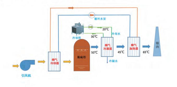 利用全焊接板式煙氣換熱器對高溫原煙氣進行深度降溫,提高脫硫效率;然后通過煙氣冷凝器對凈煙氣進行除濕,降低煙氣含水率,使凈煙氣處于未飽和狀態(tài),實現(xiàn)消白目的。