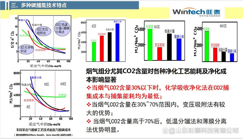 這三種碳捕集技術(shù)的特點在不同條件下都有不同的優(yōu)勢?;瘜W(xué)吸附法在煙氣濃度30%以下時在捕集成本方面具備優(yōu)勢,當煙氣濃度在30%-70%的時候變壓吸附法就有比較大的成本優(yōu)勢,而當煙氣高于70%的濃度以后低溫分餾法成本優(yōu)勢比較明顯,由于工業(yè)燃燒后的煙氣當中煙氣的濃度相對比較低,所以煙氣的二氧化碳捕集技術(shù)當中化學(xué)吸附法由于煙氣適應(yīng)性好、技術(shù)相對成熟、捕集成本低。