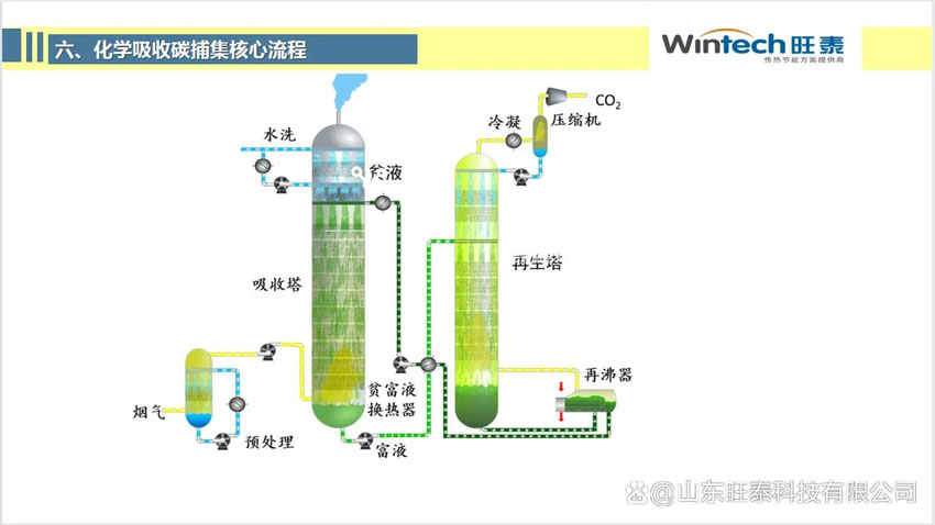 利用這種胺對二氧化碳的吸收原理整個二氧化碳捕集與吸收的核心工藝點主要是存在兩個:一個是吸收塔、另外一個是再生塔,吸收塔就是噴淋,胺的工作條件下胺在吸收塔當中吸收二氧化碳,吸收二氧化碳的氨液變成富液流經(jīng)再生塔,在再生塔當中受到一定的溫度加熱作用,富胺液在再生塔當中將二氧化碳釋放并且經(jīng)由壓縮機吸收壓縮進行濃縮,那么整個過程就完成了一個二氧化碳的吸收再生的循環(huán)過程。