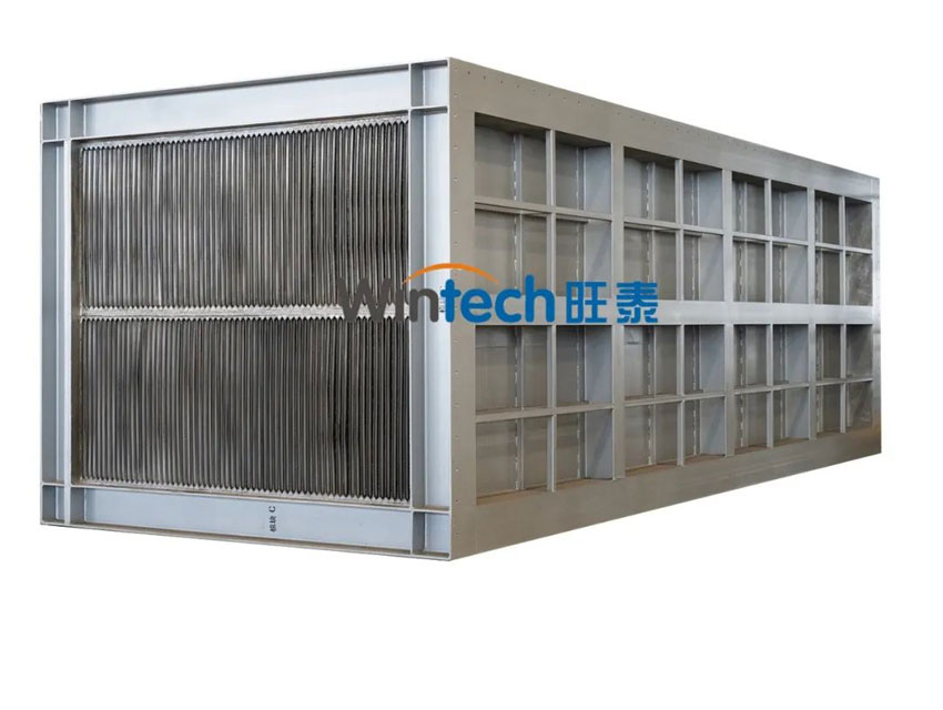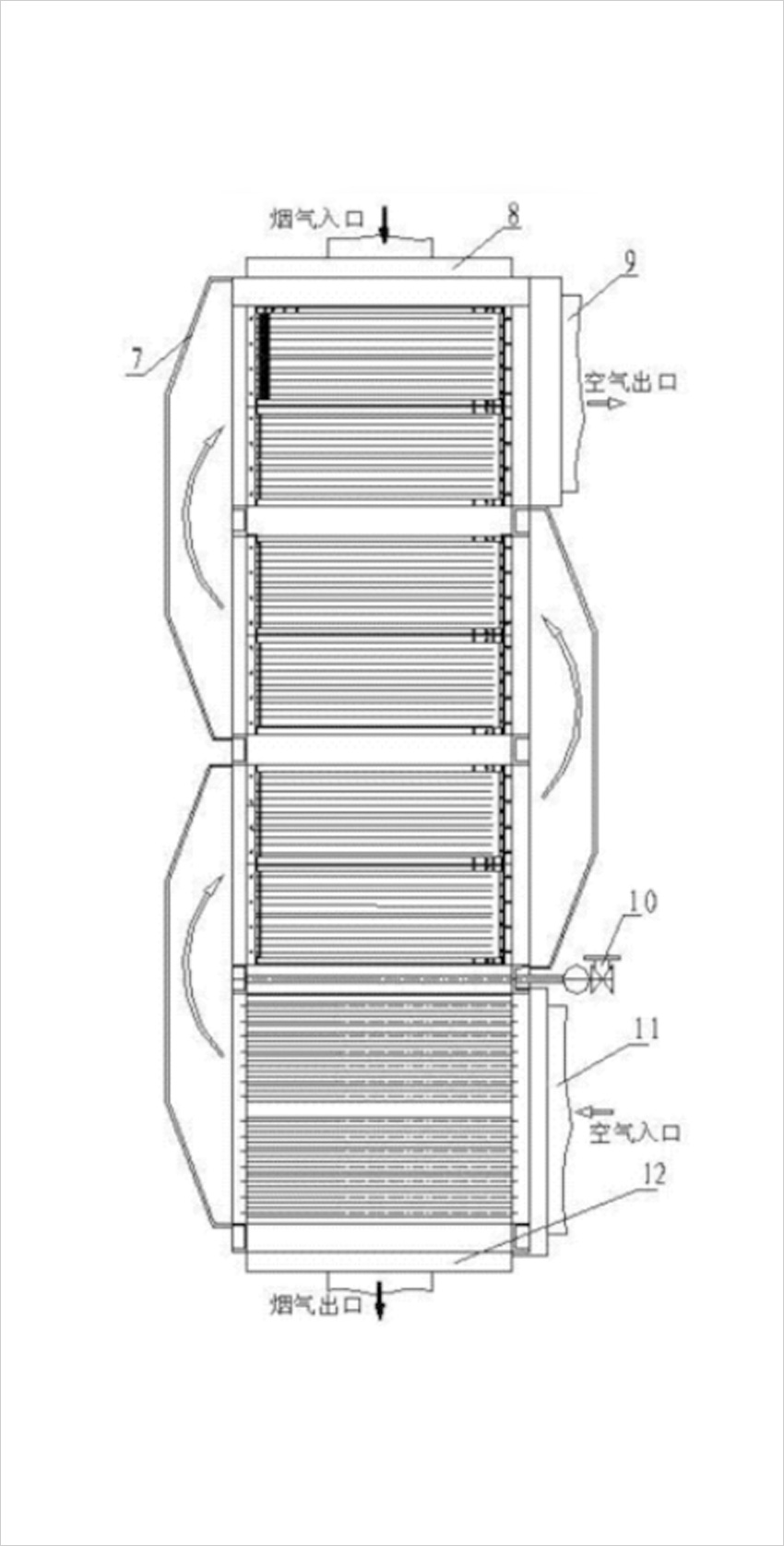 板式,多層壓制有紋路的鋼板制成,通過焊接形成長方形的板束,一個(gè)空氣預(yù)熱器由多個(gè)板束組成。預(yù)熱時(shí)煙氣由上向下通過,經(jīng)過外側(cè),換熱的空氣則橫向通過板束進(jìn)入內(nèi)部,在下部轉(zhuǎn)彎向上,兩次與煙氣交互傳遞熱量,此時(shí)的煙氣和空氣處在逆向流動(dòng)狀態(tài),能夠更好的進(jìn)行換熱。板式空氣預(yù)熱器可實(shí)現(xiàn)大型化、模塊化與組合化,具有換熱效率高,占地面積小,不易腐蝕、使用壽命長等特點(diǎn)。廣泛應(yīng)用于石油化工、冶金、電力、食品、醫(yī)藥等領(lǐng)域。
