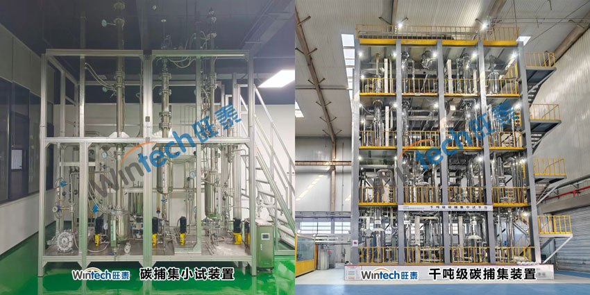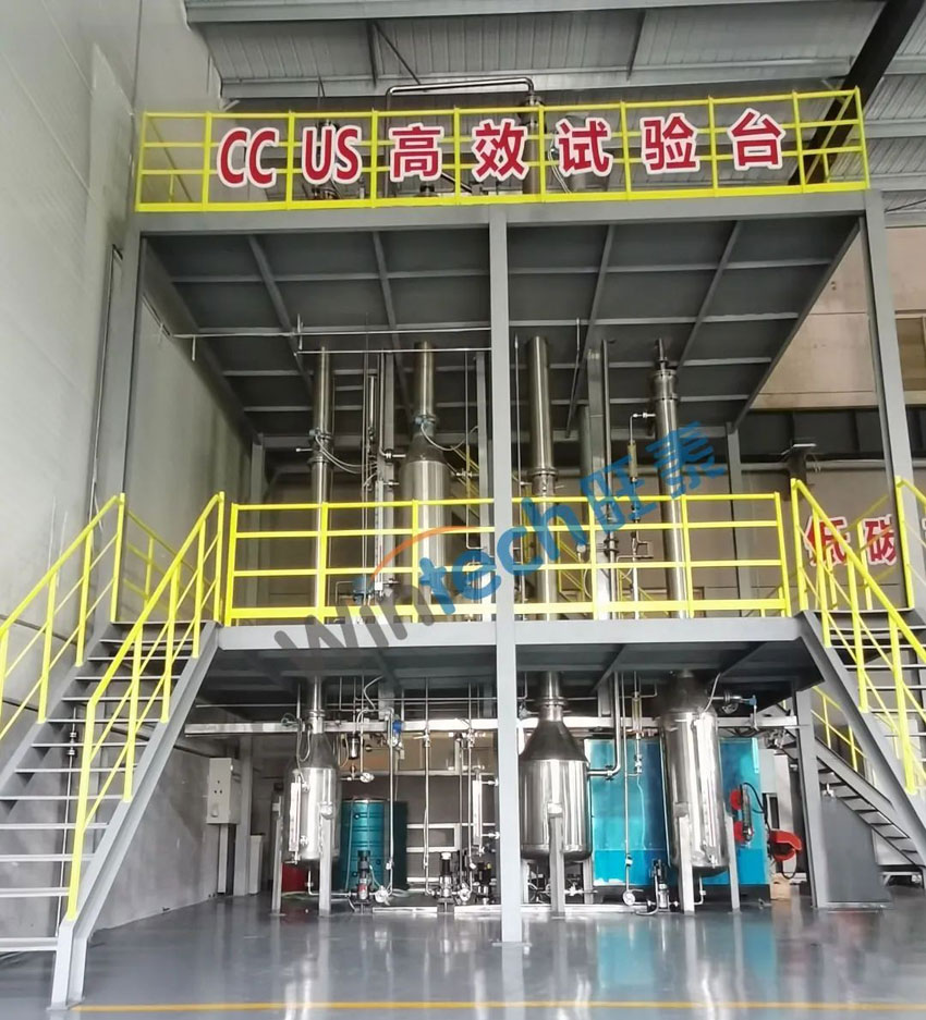 公司自建碳捕集中試平臺,煙氣量100-300Nm³/h,可進行濃度為4%-14%的二氧化碳捕集實驗,捕集率可達90%以上,捕集純度99.99%以上,再生能耗最低2.35GJ/t。
