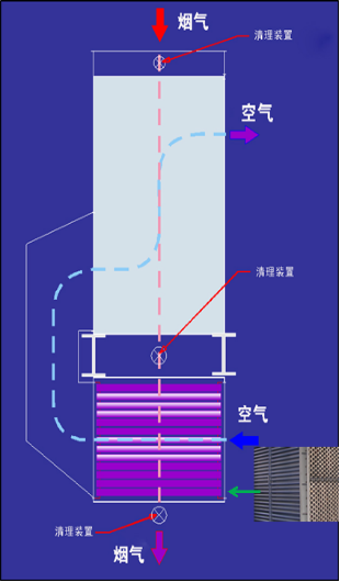 設(shè)備整體結(jié)構(gòu)如圖所示,煙氣自上向下流出,空氣側(cè)進(jìn)側(cè)出,熱冷流體采用交錯(cuò)流形式,可使流體全截面進(jìn)出,換熱效率高、壓降?。话迨綋Q熱器溫差大,換熱效果高;設(shè)備換熱面積小,占地小,設(shè)備更緊湊。