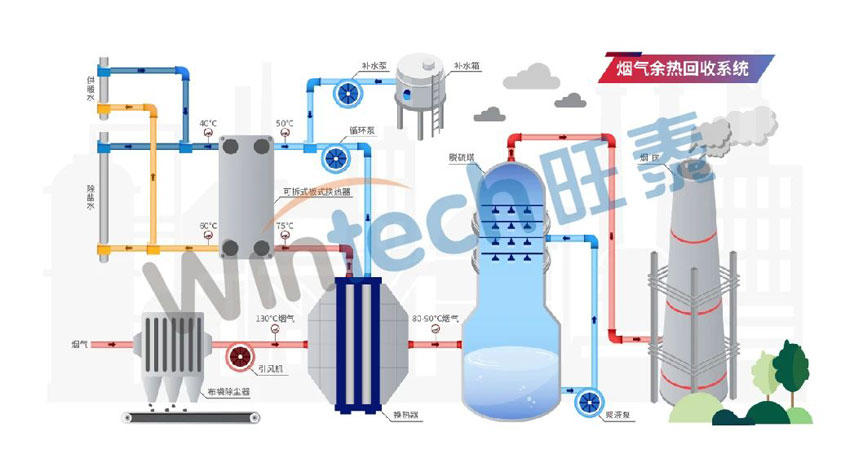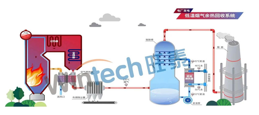 為了有效降低排煙溫度,提高鍋爐熱效率,電廠紛紛引入并創(chuàng)新應用煙氣余熱回收技術。旺泰科技針對電廠煙氣余熱回收研發(fā)除塵后低溫煙氣余熱回收系統(tǒng)以及脫硫塔后漿液余熱回收系統(tǒng)技術等,通過不同的換熱方式將煙氣中的熱量轉(zhuǎn)化為可二次利用的能源,實現(xiàn)了能源的梯級利用和高效回收。